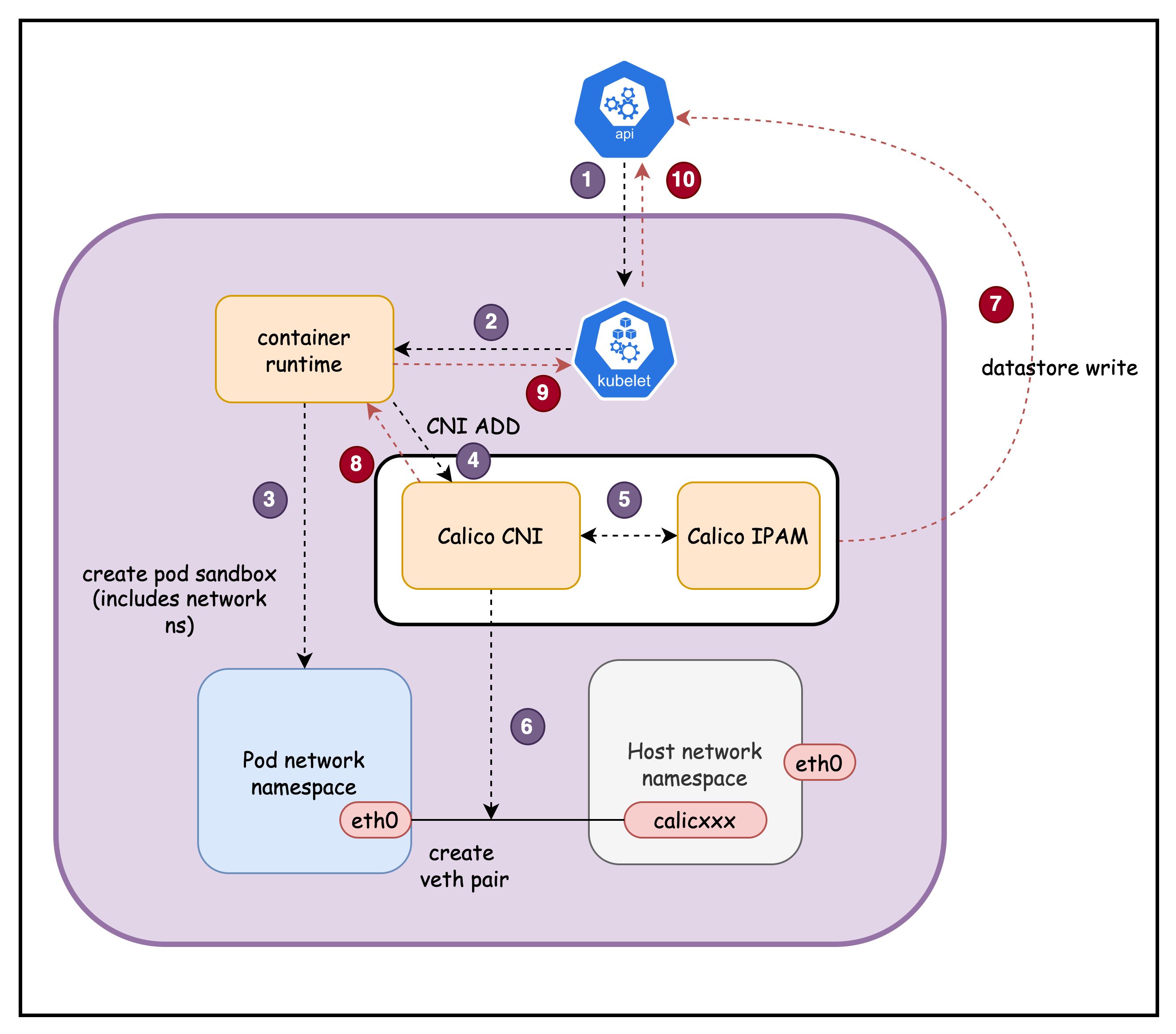 - CNI Lifecycle: When a pod is created, the Calico CNI plugin orchestrates IP allocation, veth pair creation, routing table updates, and datastore registration in a coordinated sequence.